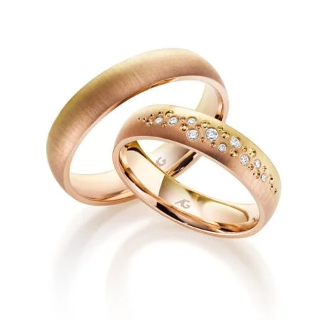 Eheringe in modernem Design verzichten häufig auf Gelbgold und greifen auf Materialien wie Silber oder Platin zurück. Jedoch gibt es auch hier spannende Kombinationen von verschiedenen Edelmetallen. Eheringe, die mehrfarbig sind, gelten als besonderer Hingucker. Sie verbinden den unverwechselbaren goldenen Schimmer mit kühlen Tönen von Silber oder Weissgold. Doch nicht nur in Bicolor finden Sie spannende, ansprechende Designs. Es gibt Eheringe, die beispielsweise Roségold, Weissgold oder vielleicht auch Platin mit Gelbgold verbinden. Hierbei handelt es sich um sehr gewagte und zugleich besonders einfallsreiche Designs. Sie weichen von den klassischen Ausführungen ab, wie viele sie mit Eheringen aus Gelbgold verbinden. Stattdessen überzeugen sie mit ihrem modernen und ausgefallenen Erscheinungsbild. Sehr edel und auffällig erscheinen sie in Kombination mit Brillanten, die die Wirkung des Rings noch einmal hervorheben. Unterstreichen Sie Ihre besondere Verbindung mit dieser speziellen Auswahl.